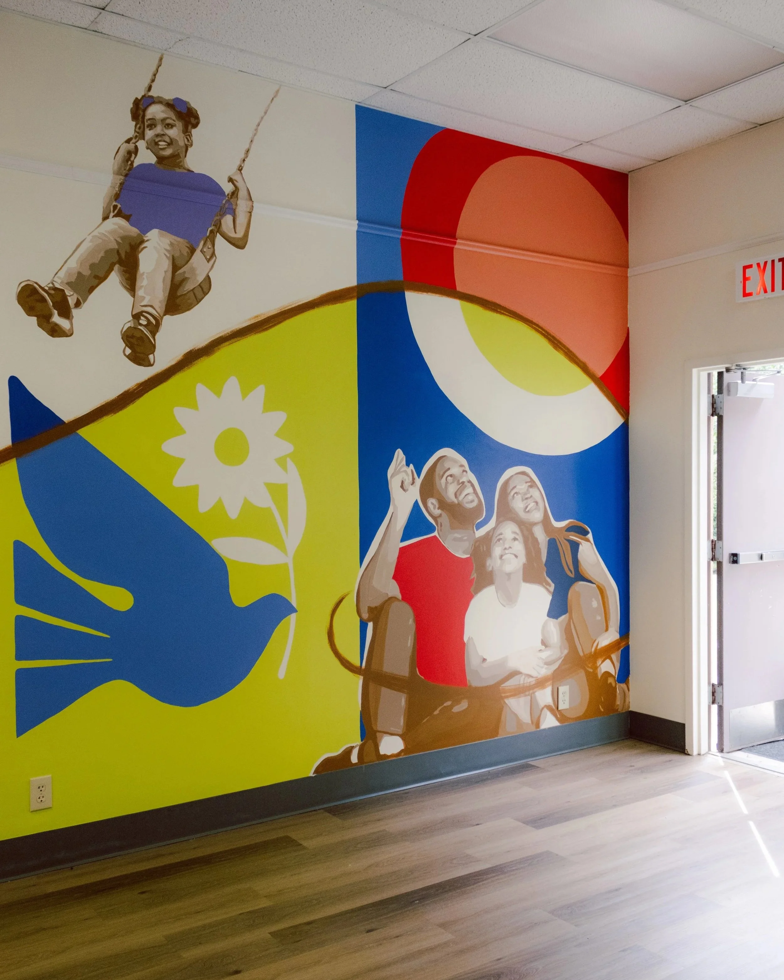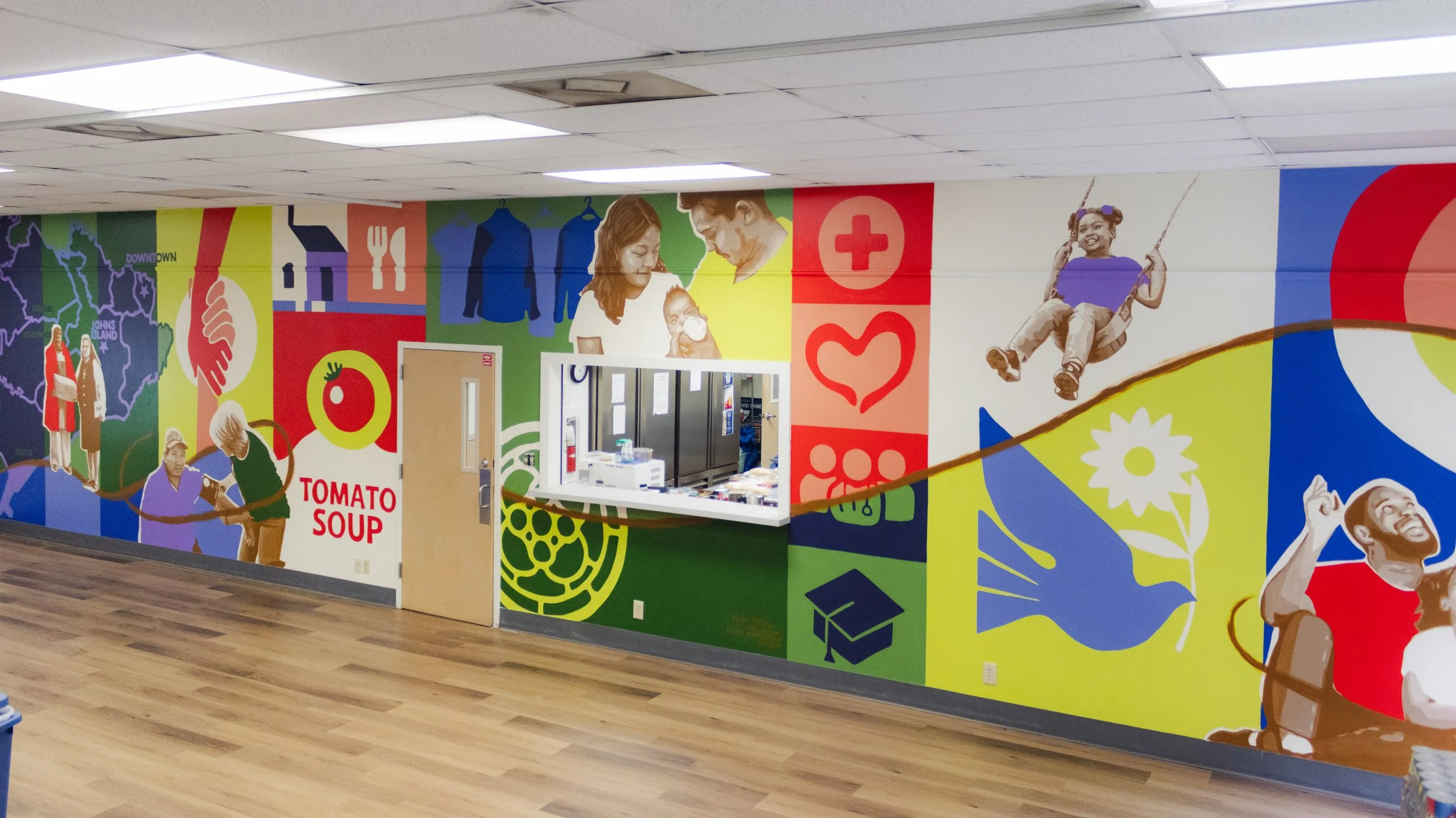 This mural completely transforms their Outreach Center to be (almost) as bright and engaging as the incredible work they do for the community! This mural at Our Lady of Mercy Community Outreach was designed to celebrate the organization’s history, mission, and the hope it brings to Charleston’s sea islands. Spanning the Outreach Center’s main wall, the artwork weaves together bright colors, historic imagery, and meaningful symbols that reflect OLM’s holistic approach to serving the community.